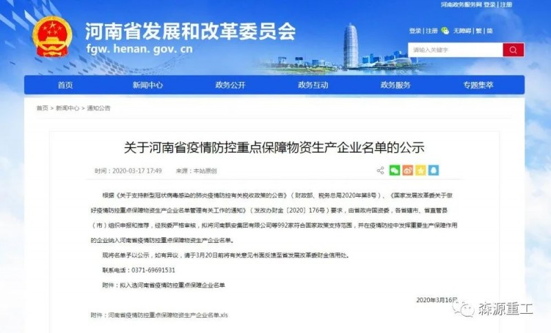 河南省疫情防控重点保障物资生产企业首批名单公示,森源重工入选啦
