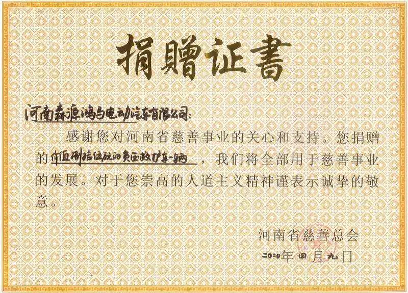 近年来,森源鸿马在自身发展的同时,始终秉承感恩之心,践行“服务于社会 贡献于国家”的理念,坚持用实际行动,开展慈善工作,先后组织了地震捐款、革命老区车辆捐赠、关爱员工慈善捐助等慈善活动。今后,森源鸿马将会继续深入参与慈善工作,积极承担社会责任,与社会各界一道,齐心协力,共同抗疫,共克时艰。